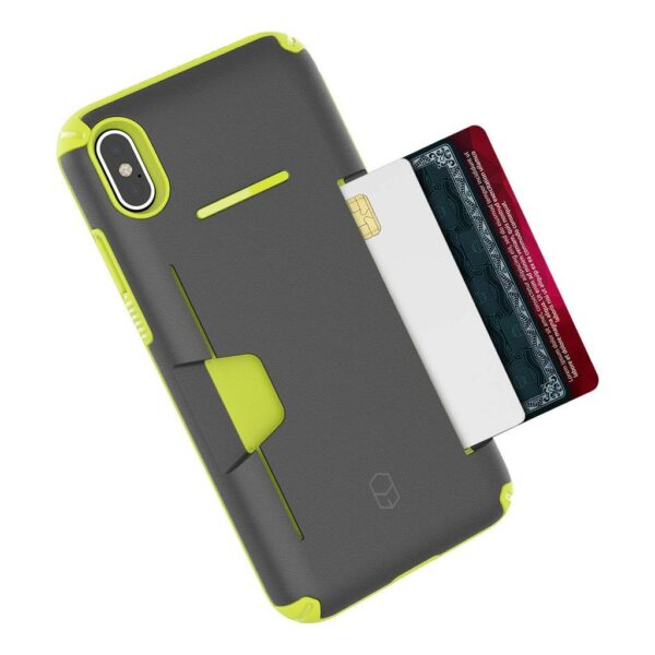 Protective dual layered case with a large lip that wraps over the edge of the screen. Can also hold up to 3 cards.